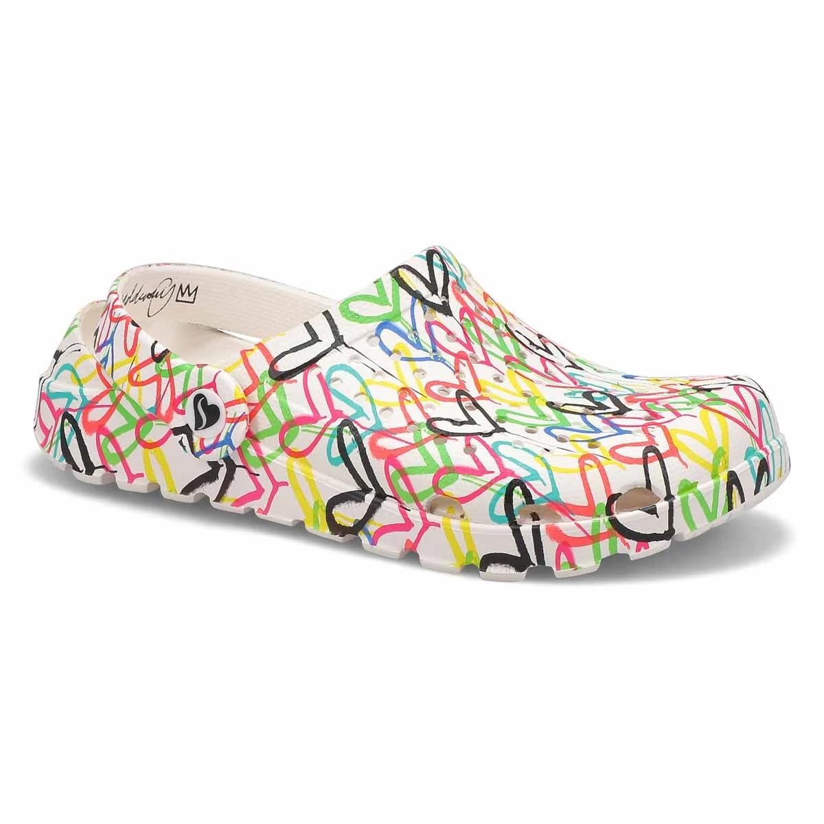 Brighten your spirits with a fun-day at the beach or pool wearing theJGoldcrown Footsteps black/ multi clog from Skechers. These water-friendly clogs feature a sculpted Foamies EVA lightweight flexible upper with colorful heart prints designed by famous muralist James Goldcrown, round toe, slip-on fit with slingback strap, Luxe-foam contoured footbed for comfort, shock-absorbing midsole and flexible traction outsole.