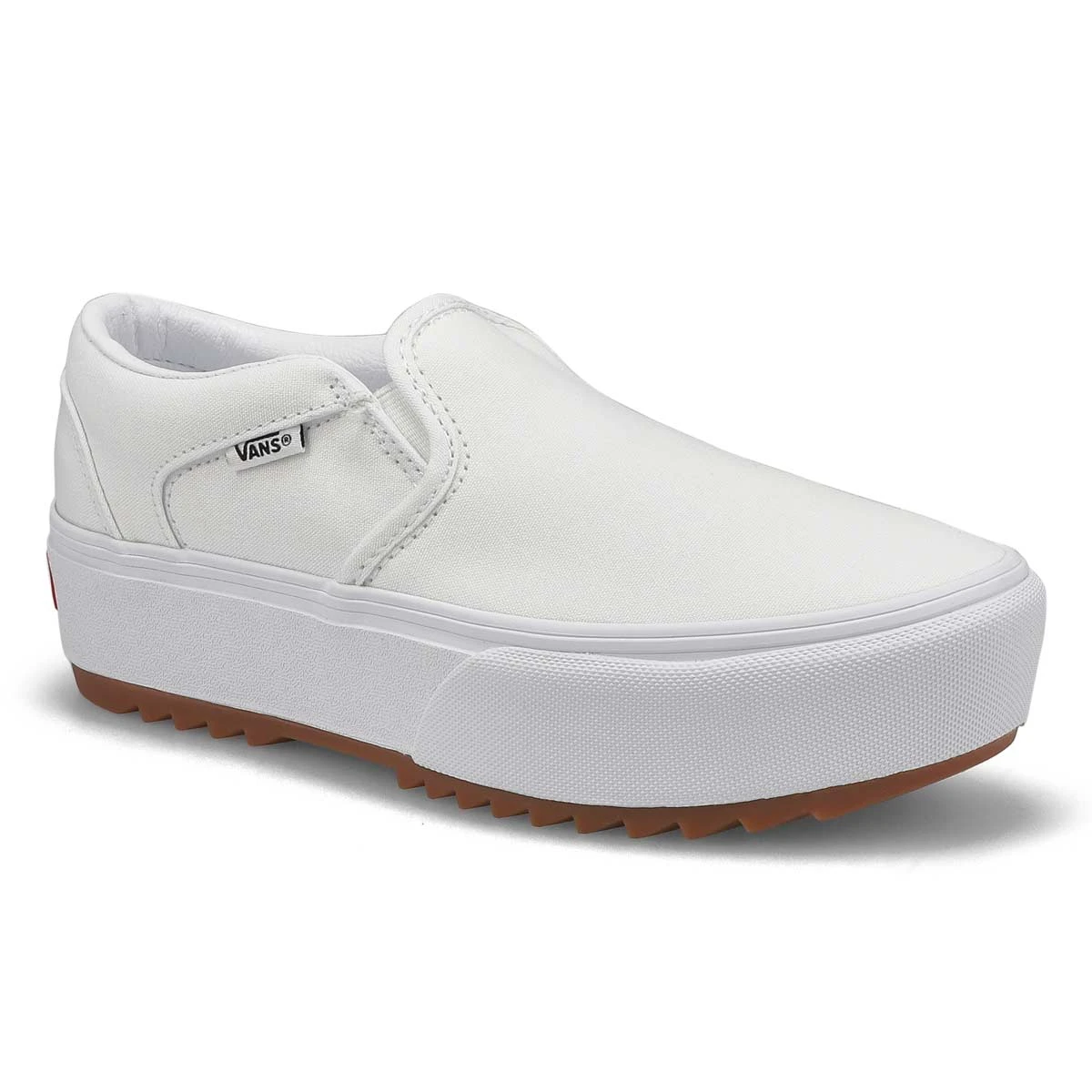Dress yourself in a cool skate park style in the Asher PlatformST white slip on sneaker from Vans. The Asher, a heritage low top, features a canvas upper and a signature rubber micro-waffle outsole. Its padded collar and insole, along with vulcanized construction give this very comfortable style the utmost in durability.
